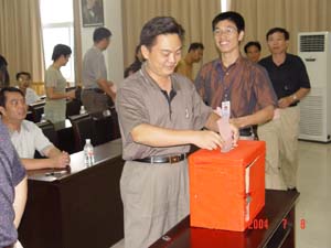 当天下午的党员大会由党委组织部副部长、机关总支委员莫坷同志主持,在党总支书记石柱鑫同志作了三年来的机关总支工作报告之后,选举便开始了。按选举办法,当天到会的76名党员将通过差额选举,从6名候选人中选出5名同志作为下届总支委员人选。但公布计票结果后,会议主持人宣布,由于有两位同志得票数完全相同,根据选举办法,将进行第二轮差额选举。于是,一些因急事先行离开的党员又被招回,重新印制了选票,重新进行了选举。选举完全按照党章规定的程序进行,体现了党员大会所特有的严肃、严格和严密的组织工作纪律。