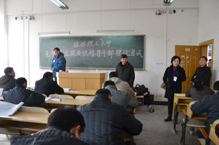为进一步推进学校干部工作科学化、民主化、制度化,促进优秀人才脱颖而出,切实提高选人用人公信度,根据《Beat365中文官方网站竞争性选拔处级领导干部工作实施办法(试行)》(桂理工党组〔2012〕12号)文件精神,12月30日上午,学校在教九楼举行了竞争性选拔处级领导干部理论考试。来自全校各部门、各单位的近200名现任副处级、正科级干部和任职满三年的副科级干部、学院院长助理、教研室(实验室)主任,具有高级职称或博士学位的专业技术人员参加了竞争性选拔考试。 学校党委书记张学洪,校长解庆林,副校长陈贵英,正厅级调研员张鹏在考试中亲临现场巡视。校领导们此前多次强调,一定要树立围绕发展选人用人的导向,树立凭实绩选人用人的导向,让优秀的人才脱颖而出。同时增强选人用人的公信度,倡导风清气正的用人氛围,在全校树立一种正确的用人导向,倡导学习型干部理念,提高干部队伍素质。 本次竞争性选拔考试,是学校进一步深化干部人事制度改革,不拘一格选拔优秀干部所做的一次积极探索,通过竞争性选拔干部这一方式,拓宽了干部选拔任用的视野,对于从整体上加强干部队伍管理,特别是激发干部队伍活力有重要意义。