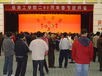 农历大年初一,虽然天气微寒,但学院体育馆三楼大厅内却是一派暖意融融。 院内教职员工及其家属、留校过年的学生纷纷来到这里,参加一年一度的春节团拜会。“年年岁岁花相似,岁岁年年人不同”,今年的春节团拜会在宽敞、明亮、气派的体育馆大厅举行,气氛更胜以往,除节日的欢乐外,在教职员工心中平添了一种自豪感。人们相互握手,互致问候,整个大厅一派喜气。