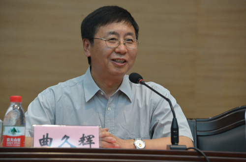 学校党委书记张学洪宣读曲久辉院士简介:曲久辉院士,1957年生于吉林,工学博士,研究员,博士生导师,国家杰出青年基金获得者,2009年10月当选为中国工程院院士。2006年至2012年期间,担任中国科学院生态环境研究中心主任。曲久辉院士长期致力于水污染控制及饮用水质安全保障研究,取得了理论、技术和应用的系统创新成果。解决了水体砷污染治理和一步法附砷、除氟等国际性工程技术难题,创建了饮用水安全保障新工艺。开发出物化-生物-生态协同的水源水质改善新技术,主持建成我国第一个生态型水源(天津泰达);建立强化净化、安全输配和末端保障技术系统,解决了我驻外60多个使领馆饮水安全问题。开创感应电化学净水技术方向。提出复极感应电化学净水原理,发明系列电化学水处理关键技术,形成了复极感应电氧化、电还原、电凝聚和电生物净水技术与装备系统,在野战军、武警、西藏维稳、抗震救灾、饮水扶贫等方面广泛应用。曲久辉院士在本领域国际重要刊物上发表SCI收录论文300余篇,获授权国家发明专利和国际发明专利30余项,获得国家科技进步奖二等奖2项、国家技术发明奖二等奖1项,获何梁何利科学与技术进步奖,国际水协东亚和全球创新项目奖,以及省部级奖项8项。