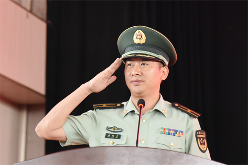 武警桂林市支队副支队长唐超平少校代表承训部队作军训动员讲话