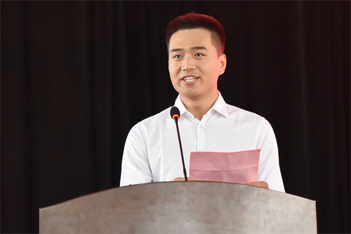 典礼上,在校学生代表、校学生会主席雷壮发言。他代表学长学姐对新同学的到来表示热烈欢迎,并与学弟学妹们分享自己的亲身体验:在大学的时光里,要把握珍惜每一个学习机会,勇往直前,不懈努力,去迎接每一个挑战,用大学的精彩,用知识的力量,致最美丽的青春。