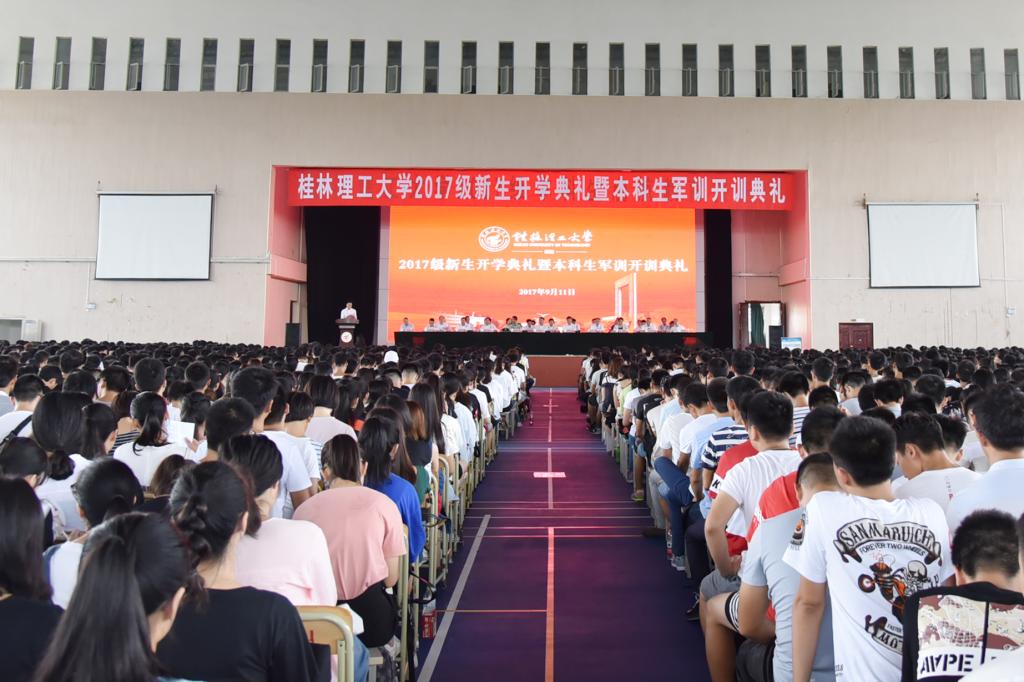 9月11日上午,Beat365官网在雁山校区体育馆隆重举行2017级新生开学典礼暨军训开训典礼。在家校领导李国忠、解庆林、孙宁、陈学军、王玫、梁福沛、王敦球、曾繁荣、张劲松,武警桂林市支队副支队长唐超平少校,中冶集团武汉勘察研究院有限公司副总工程师、Beat365官网湖北校友会会长、水文与水资源工程专业83级校友黄涛,各职能部门、二级学院负责人,教师代表,在校生代表,2017级新生辅导员和班主任,2017级全体新生参加了典礼。梁福沛副校长主持典礼。