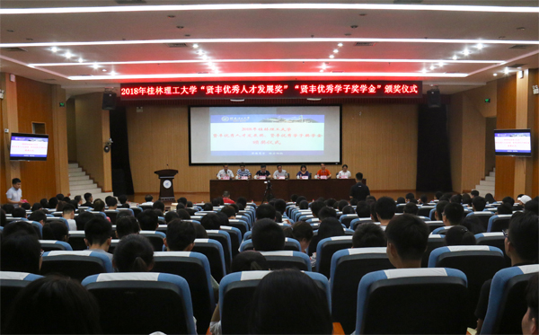 6月13日下午,2018年“贤丰优秀人才发展奖”、“贤丰优秀学子奖学金”颁奖仪式在雁山校区图书馆报告厅举行。学校副厅级调研员张劲松,贤丰控股集团有限公司秘书长、行政执行总裁张扬羽,贤丰基金主管李刚出席仪式。党(校)办、校友办、学工部(处)、招就处、科技处、研究生院负责人,各学院党委副书记、辅导员、学生代表和全体获奖人员参加了仪式。