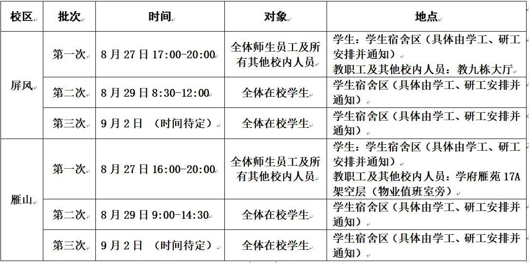 全体返校学生、教职员工(含校外)及其住校园内的家属、校内从事经营活动人员、校内工地施工及管理人员、校内其他住户。(附属小学、幼儿园由属地教育管理部门统筹安排检测)