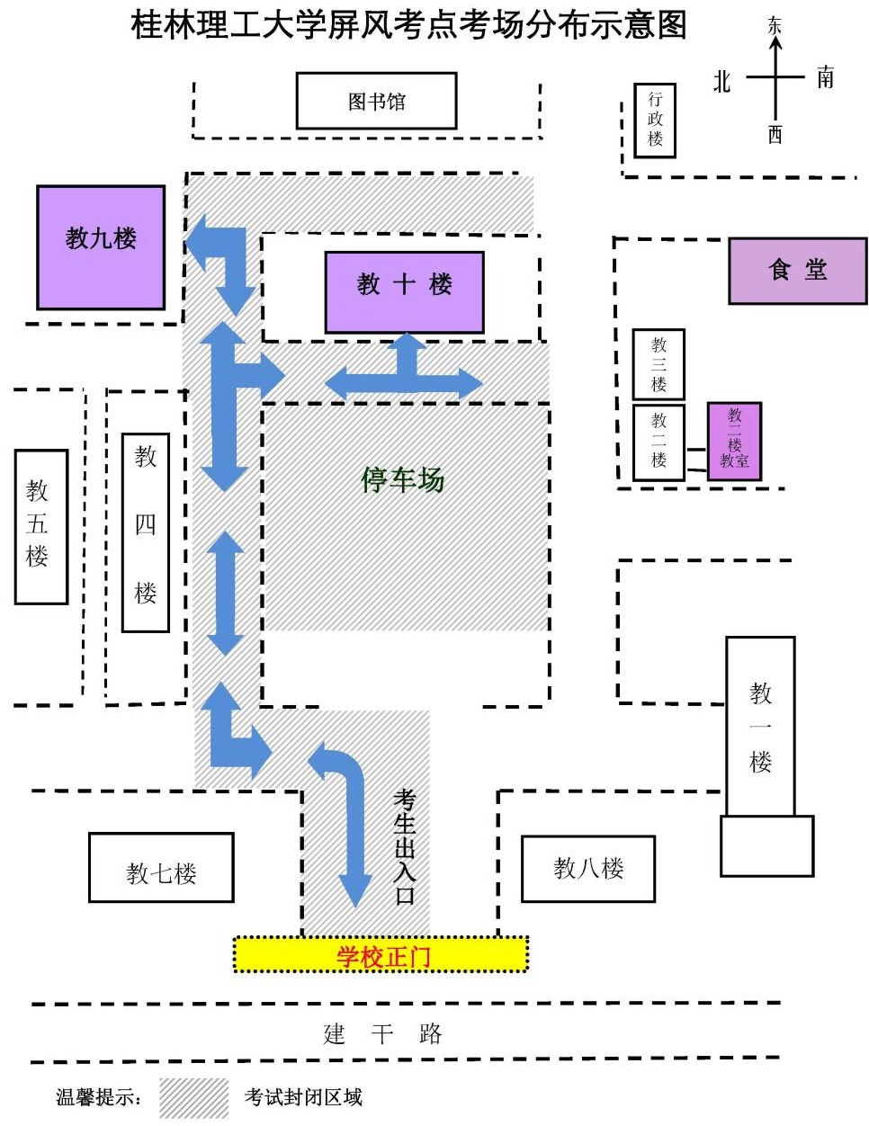 因广西高等教育自学考试于4月16日、17日在Beat365官网屏风校区教九楼、教十楼举行,为做好疫情防控工作,保证校园安全,2022年4月16日7点至2022年4月17日18点,将教九楼、教十楼及周边区域实行封闭管理,如图所示,所有考生只允许在封闭区内活动,请Beat365官网师生不要进入封闭区,所有考生从正大门(西门)北半侧进出校,Beat365官网教职员工行人、车辆从正大门(西门)南侧进出校。