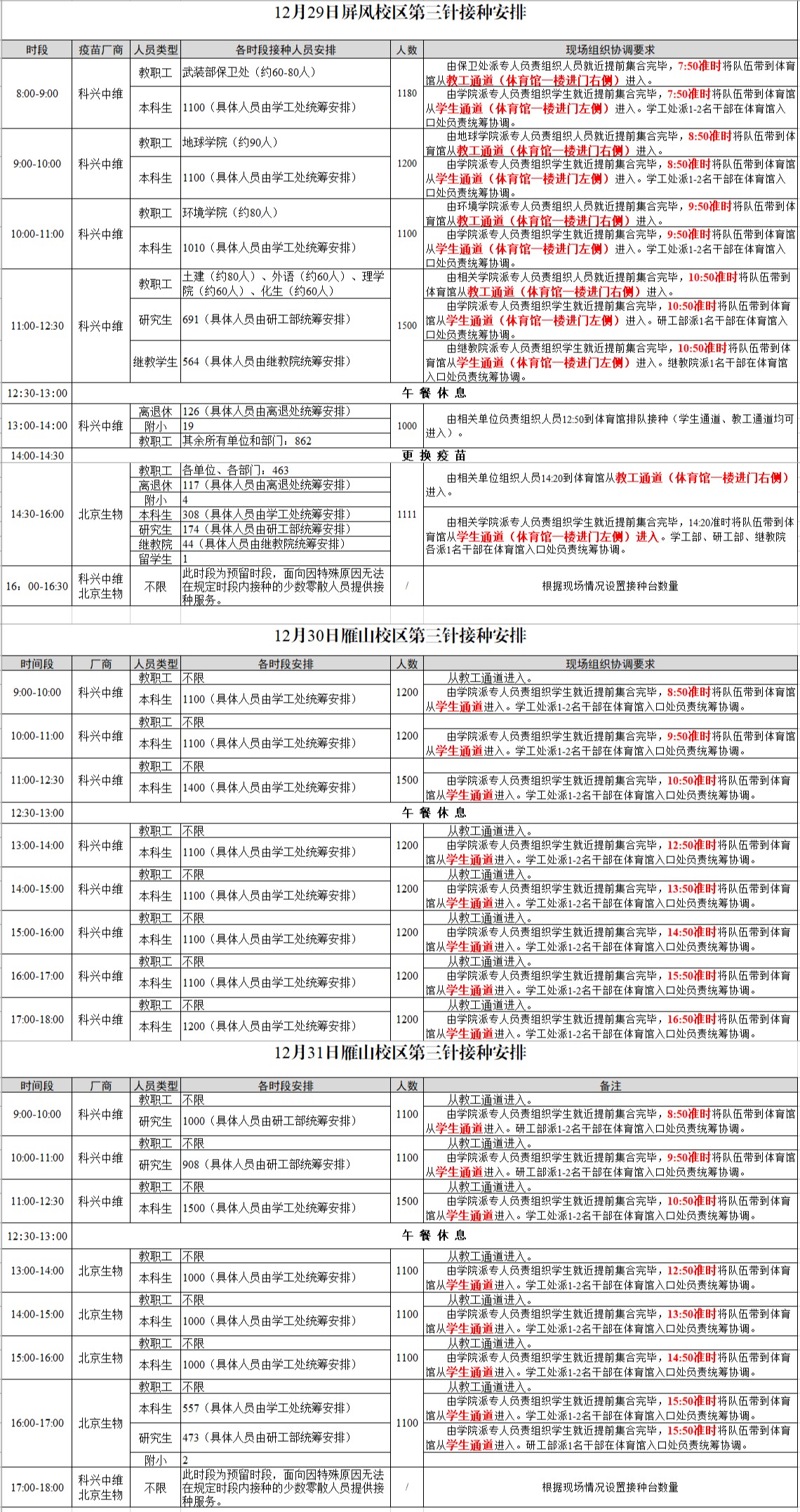两校区各时段的具体计划安排详见附件1。以上安排是根据预测的接种速度进行的初步安排,具体情况可能会受实际接种速度和疫苗供应情况所影响,如有变动,另行通知,请大家及时关注。