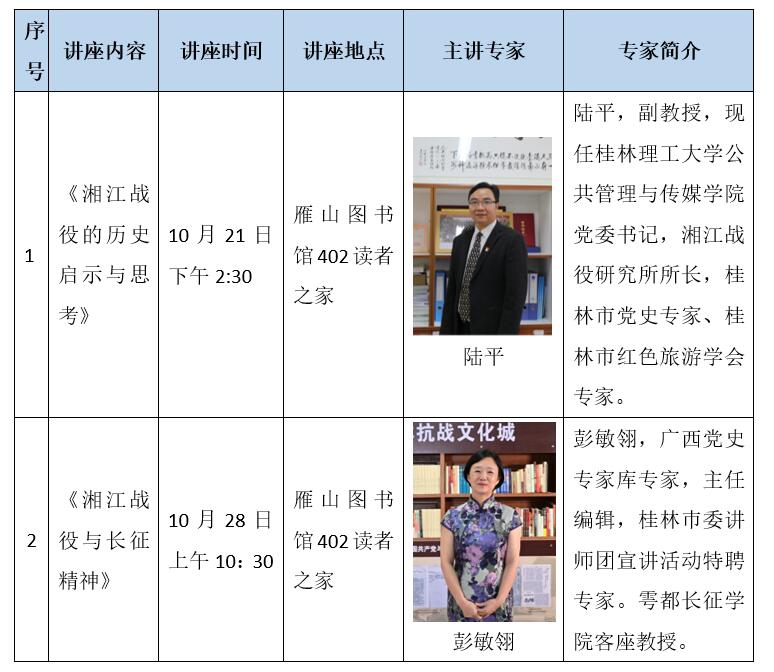 为深切缅怀湘江战役英烈,秉承革命先烈遗志,传承与弘扬伟大长征精神,图书馆和党委宣传部特邀请知名专家以己为书,从不同角度讲解湘江战役,引领读者重忆湘江战役艰苦壮烈的画面,学习先烈们“勇于胜利、勇于突破、勇于牺牲”的革命精神,争做新时代有志青年。