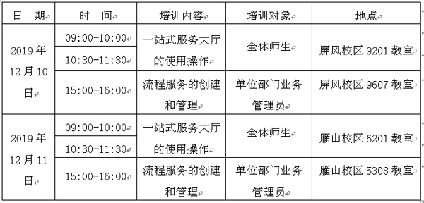 全校师生: 根据“不忘初心、牢记使命”主题教育征集意见,响应广大师生诉求,给全校师生提供更好的信息化服务,提高日常事务的服务效率,学校“一站式服务大厅”部署与测试工作已完成,即将开放试运行,现代教育技术中心计划对全校师生进行业务培训,具体事项安排如下: 一、培训内容: 1.一站式服务大厅的使用操作(全体师生); 2.流程服务的创建、管理(单位部门业务管理员)。