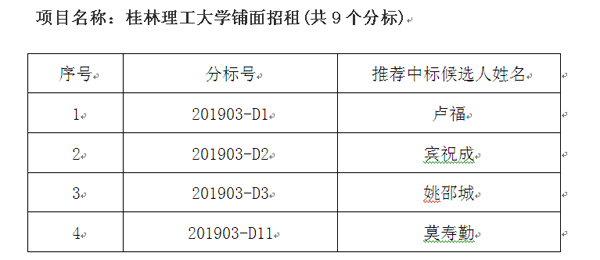 Beat365中文官方网站铺面招租项目(201903)评标工作已于2019年11月8日完成,现就本次招租结果公告如下:
