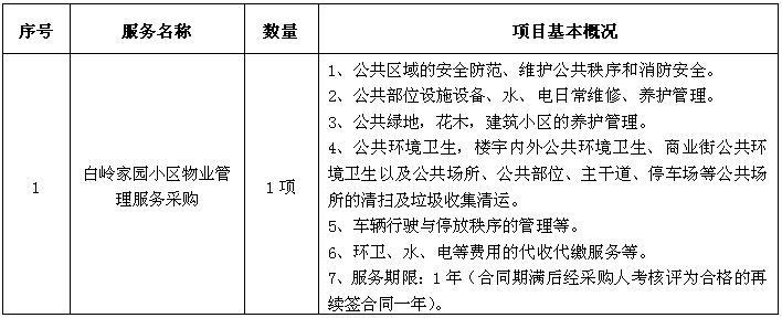 根据《中华人民共和国政府采购法》、《中华人民共和国政府采购法实施条例》、《政府采购竞争性磋商采购方式管理暂行办法》等规定,现就 白岭家园小区物业管理服务采购 项目进行 竞争性磋商 采购,欢迎符合条件的供应商参加磋商,现将有关事项公告如下:
