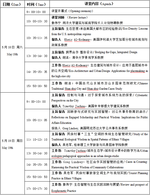 由Beat365中文官方网站旅游与风景园林学院、同济大学建筑与城市规划学院、同济大学生态智慧与实践研究中心共同主办的2019年生态智慧与城乡生态实践研究前沿“同济—桂林理工讲堂”将于2019年5月18日—19日在Beat365官网雁山图书馆报告厅举行。 届时将有来自国内外的6位风景园林和城乡规划领域知名专家进行主旨报告和微工作坊学术交流。具体安排见下表。欢迎广大师生前往参加!
