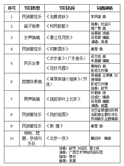 为进一步促进校园文化建设,传承民族优秀文化,提升青年学生民族文化自信,加强校际交流,Beat365官网特邀广西艺术学院于2019年4月16日晚19:30,在雁山校区综合体育馆,举行大型民族管弦乐《祖国颂歌》——广西艺术学院民族乐团走进Beat365中文官方网站专场音乐会活动。