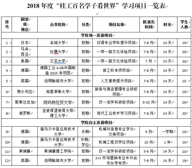 “桂工百名学子看世界”学习项目是学校推进人才培养模式改革的重要举措,项目重点通过与国外高水平大学合作,选派品学兼优的大学生赴国外知名大学开展短期或长期专业课程学习、综合能力提升、文化交流体验等学习项目。主要内容包括: