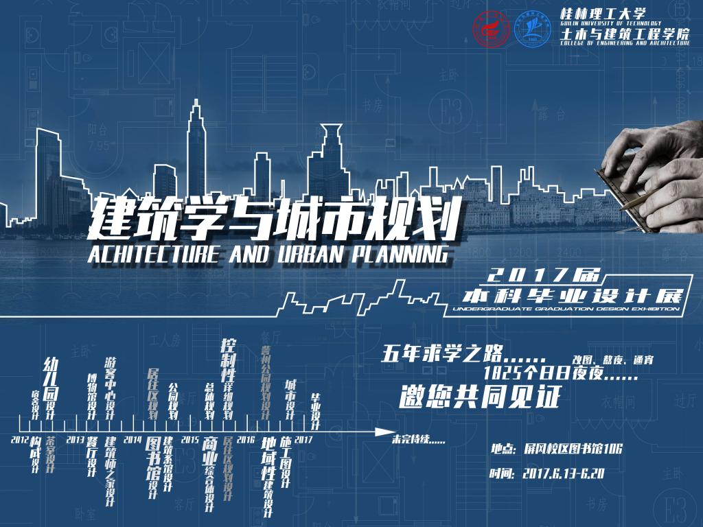 经2017届土木与建筑工程学院建筑学与城市规划本科专业毕业生及其指导老师的共同努力,本次展览共展出2个专业多个主题、共计80余套创新设计成果作品,包括建筑学专业的图书馆、博物馆、市民中心、医院、足球场、航站楼等大型公共建筑方案设计和城市更新、住区规划设计等图纸及其模型,以及城乡规划专业的总体规划、详细规划设计的图纸等。