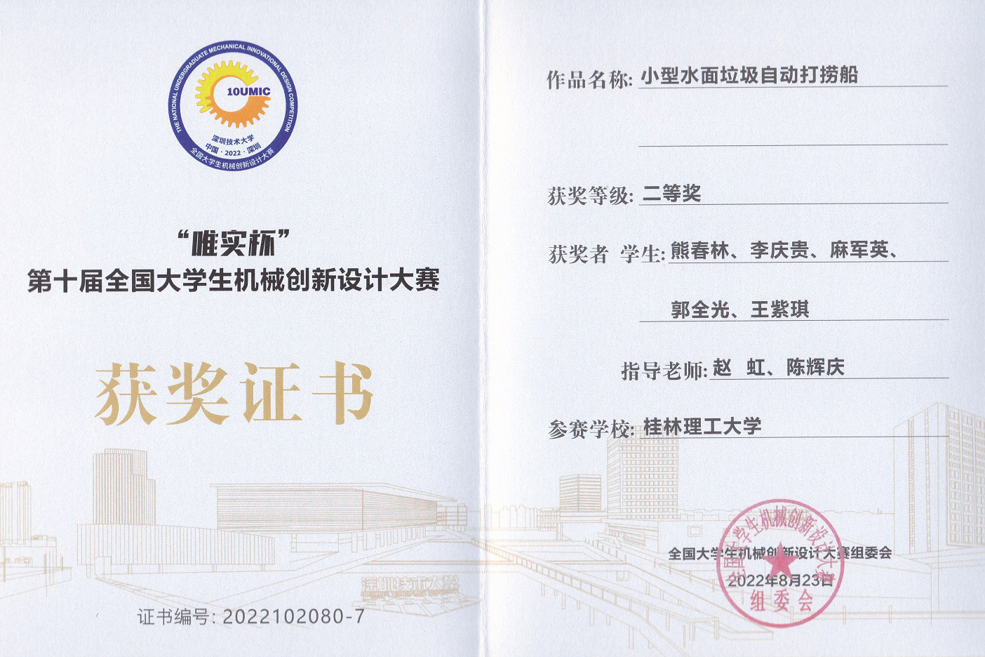近日,第十届全国大学生机械创新设计大赛决赛在深圳技术大学举行。本次大赛由全国大学生机械创新设计大赛组委会和教育部高等学校机械学科教学指导分委会主办,以“自然·和谐”为主题,内容为设计与制作仿生机械和生态修复机械,共有来自全国30个省(直辖市、自治区)的704所高校的5972件作品参与大赛各个分赛区的选拔赛。由Beat365官网机械与控制工程学院熊春林、李庆贵、麻军英、郭全光、王紫琪等学生组成的参赛队在赵虹老师和陈辉庆老师指导下完成的参赛作品《小型水面垃圾自动打捞船》从广西赛区脱颖而出,获得全国二等奖。