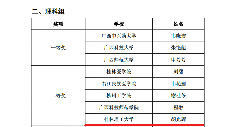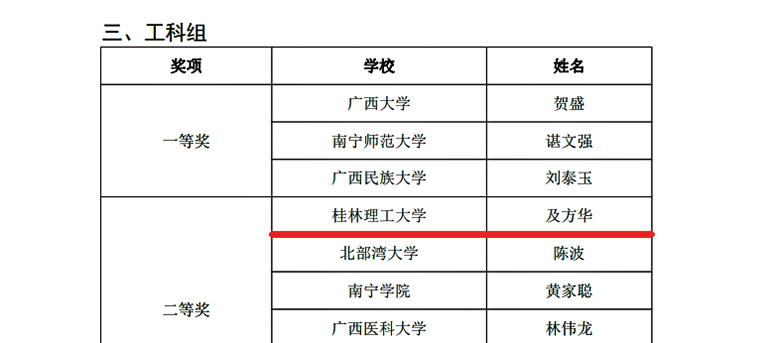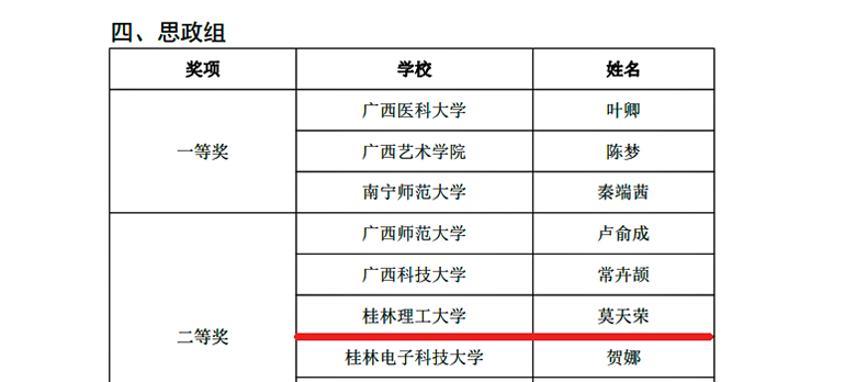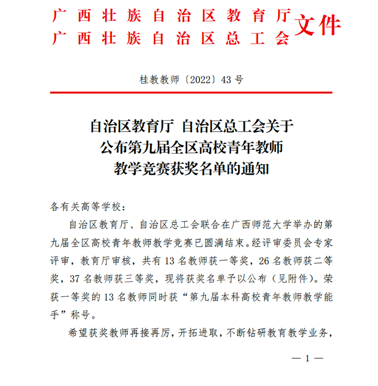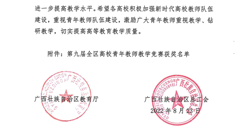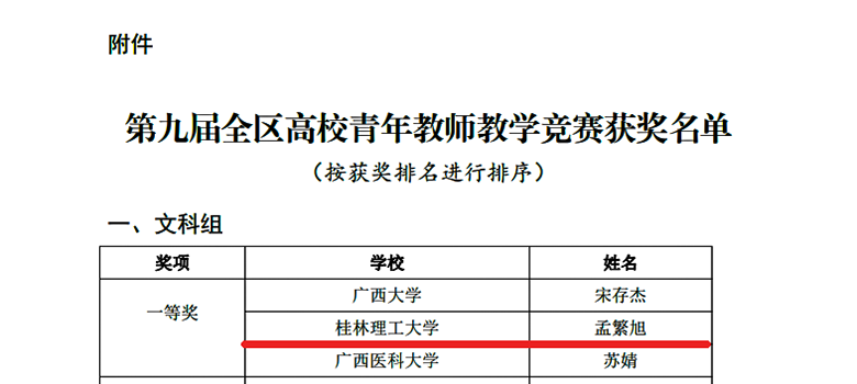 近日,自治区教育厅、自治区总工会联合下文,公布了第九届全区高校青年教师教学竞赛获奖名单。Beat365官网选派的4位选手全部获奖,取得一等奖1项、二等奖3项的好成绩,其中外国语学院孟繁旭获文科组一等奖、理学院胡光辉获理科组二等奖、化学与生物工程学院及方华获工科组二等奖、马克思主义学院莫天荣获思政组二等奖。