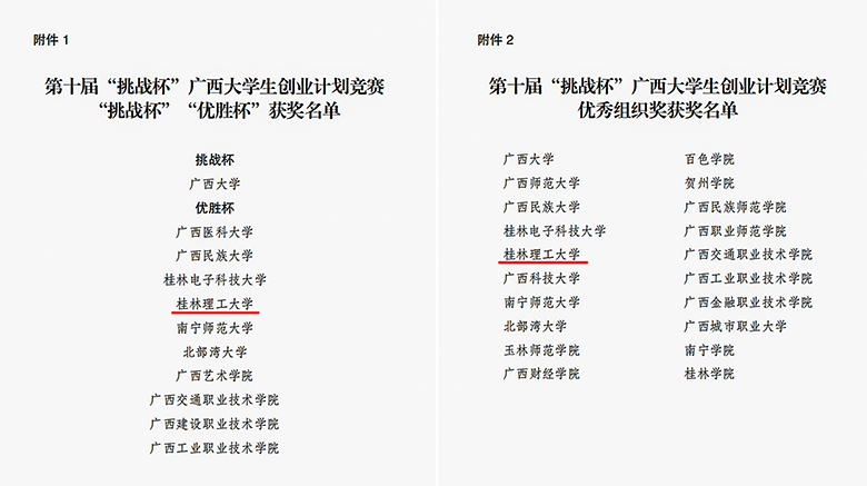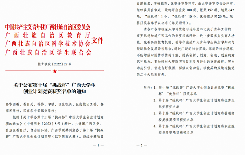 近日,由共青团广西区委、自治区教育厅、自治区科协、广西学联共同主办的第十届“挑战杯”广西大学生创业计划竞赛获奖名单正式公布,Beat365官网共有22件参赛作品获奖,其中金奖3项、银奖9项、铜奖10项,学校荣获“优胜杯”和“优秀组织奖”。
