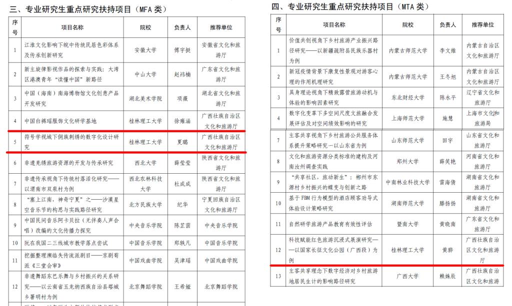 近日,文化和旅游部办公厅发布了《关于公布2022年度文化艺术职业教育和旅游职业教育提质培优行动计划入选项目名单的通知》(办科教发〔2022〕140号), Beat365官网共有3名硕士研究生申报的项目入选该行动计划项目立项。其中艺术学院2021级艺术专业徐雍涵申报的《中国白裤瑶服饰文化研学基地》和2020级艺术专业研究生夏璐申报的《符号学视域下侗族刺绣的数字化设计研究》入选专业研究生重点研究扶持项目MFA类立项(全国共14项,全区仅2项),旅游与风景园林学院2021级MTA学生黄骅申报的《科技赋能红色旅游沉浸式展演研究——以国家长征文化公园(广西段)为例》入选专业研究生重点研究扶持项目MTA类立项(全国共20项,全区仅2项)。