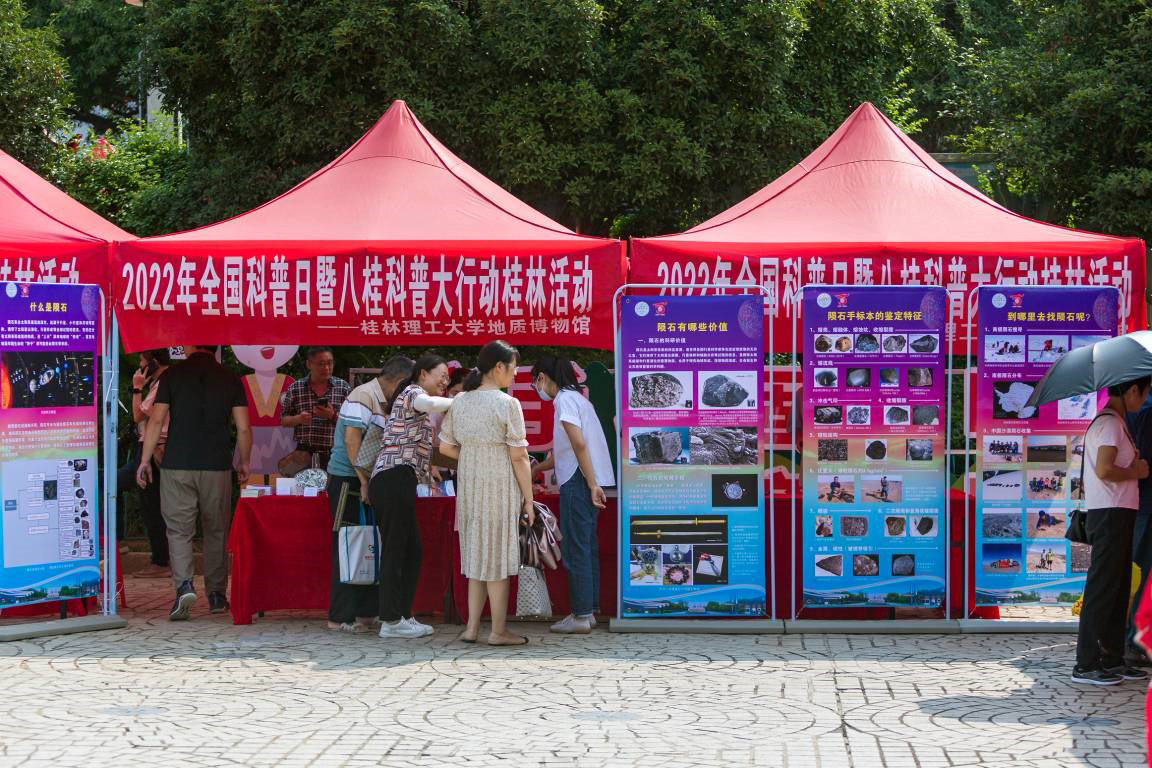 科普日活动桂林市启动仪式在临桂区金山广场举行,Beat365官网地质博物馆设置的“天外来客——陨石探秘”专区吸引了广大市民和中小学生参观咨询。此外,受自治区科协邀请,作为广西“大手拉小手,科普报告希望行”专家组成员,9月18日至22日,Beat365官网地质博物馆选派陈宏毅和李学森两位科普专家分别在河池市宜州区、罗城仫佬族自治县等地中小学校开展科普讲座进校园活动,同时在桂林市开展桂林山水蕴藏的“地球故事”系列短视频录制活动。