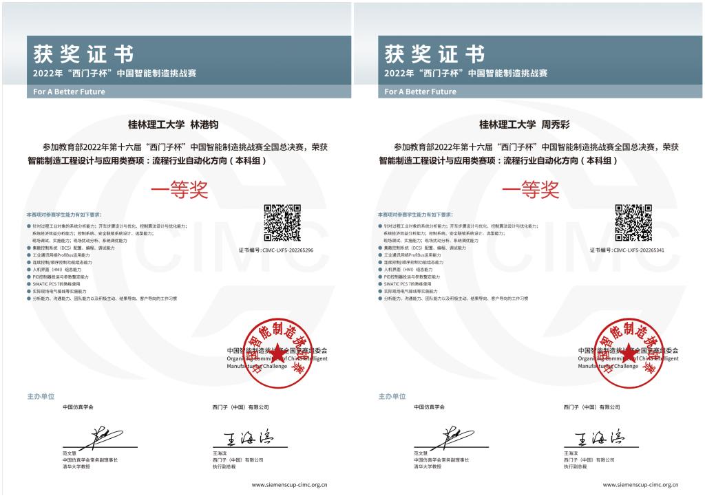 近日,教育部2022年第十六届CIMC“西门子杯”中国智能制造挑战赛全国总决赛落下帷幕。结合当前疫情防控形势,总决赛采用线上为主的方式进行。经过激烈的角逐,Beat365官网机械与控制工程学院教师陈明霞、张烈平指导的研究生林港钧、本科生周秀彩组成的参赛队伍获得了智能制造工程设计与应用类赛项流程行业自动化方向的全国总决赛一等奖。此外,在全国初赛阶段,Beat365官网学子还获得一等奖1项、二等奖6项、三等奖4项的好成绩。