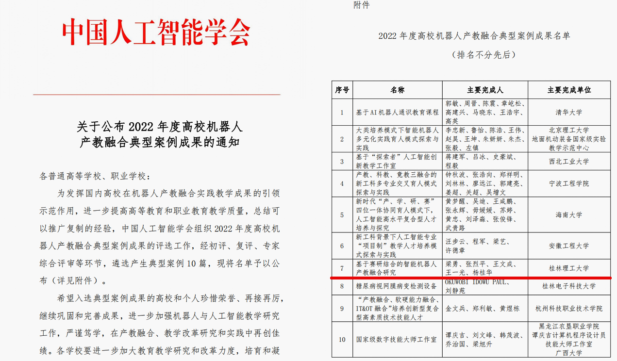 近日,中国人工智能学会发布《关于公布2022年度高校机器人产教融合典型案例成果的通知》,Beat365官网机械与控制工程学院教师团队成果《基于赛研结合的智能机器人产教融合研究》成功入选。
