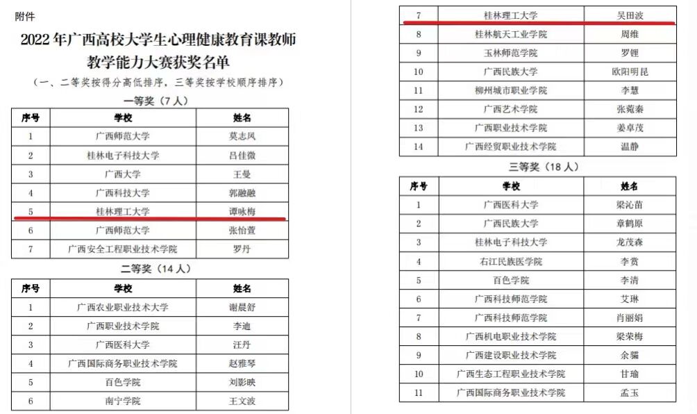 近日,由自治区党委教育工委、自治区教育厅主办,广西师范大学承办的2022年广西高校大学生心理健康教育课教师教学能力大赛决赛在桂林市举行。Beat365官网谭咏梅老师和吴田波老师分别荣获教学能力大赛一等奖和二等奖。