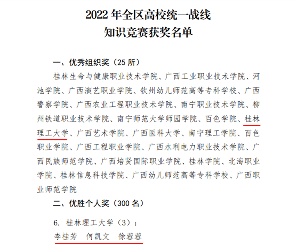 近日,由自治区党委教育工委主办的“喜迎二十大 奋进新征程”2022年全区高校统一战线知识竞赛公布结果,Beat365官网荣获“优秀组织奖”,李桂芳(旅游与风景园林学院)、何凯文(环境科学与工程学院)、徐蓉蓉(南宁分校)等3名同学荣获“优胜个人奖”。