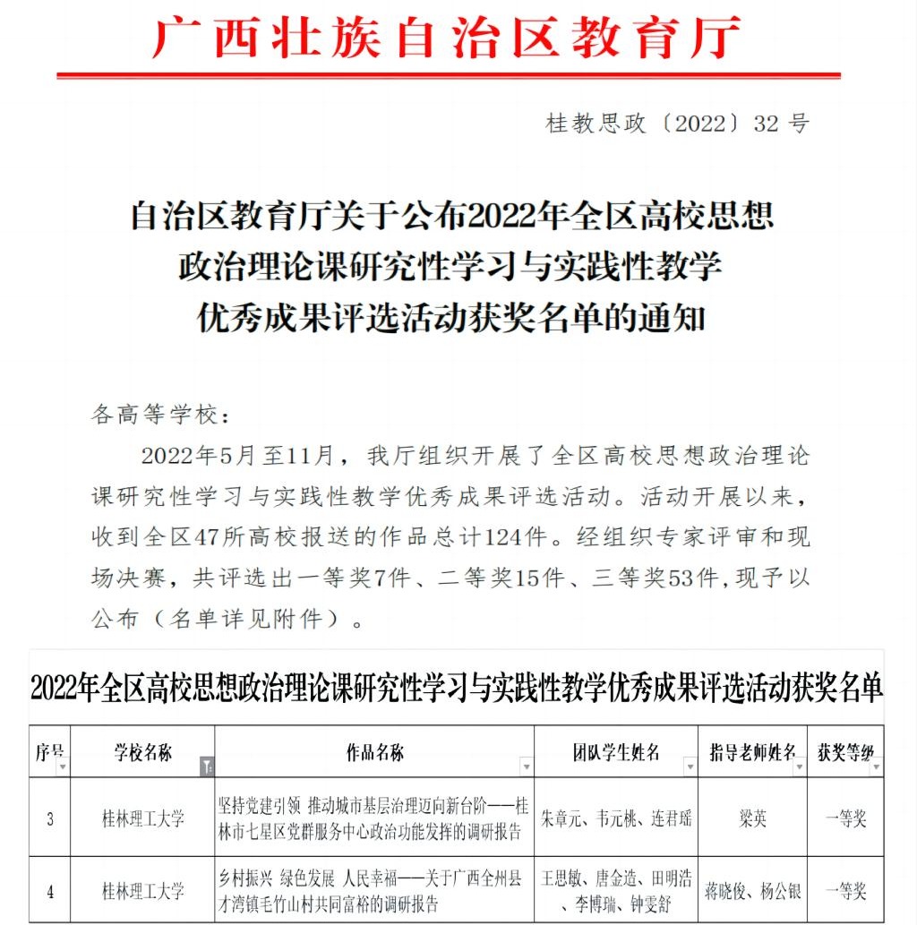近日,自治区教育厅公布了2022年全区高校思政课研究性学习与实践性教学优秀成果评选活动获奖名单。Beat365官网马克思主义学院梁英老师指导,朱章元、韦元桃等3名同学组成团队提交的作品《坚持党建引领推动城市基层治理迈向新台阶——桂林市七星区党群服务中心政治功能发挥的调研报告》以及Beat365官网马克思主义学院蒋晓俊、杨公银老师指导,王思敏、唐金造等5名同学组成团队提交的作品《乡村振兴.绿色发展.人民幸福——关于广西全州县才湾镇毛竹山村共同富裕的调研报告》从决赛中脱颖而出,双双获得一等奖。