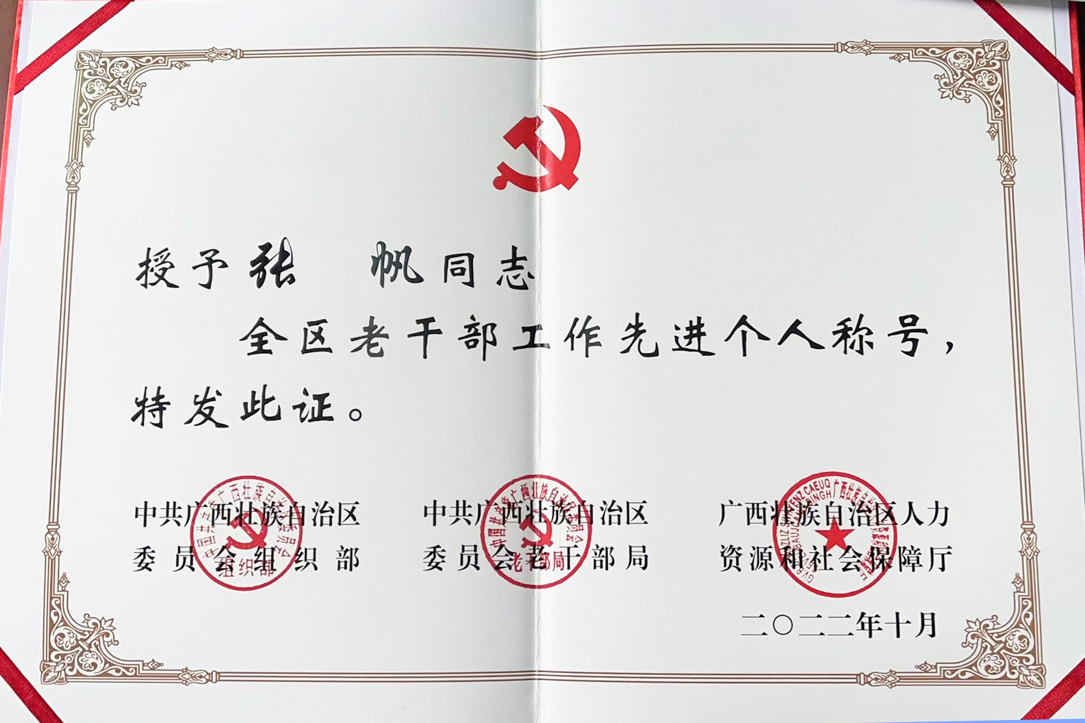 近日,自治区党委组织部、老干部局和人力资源社会保障厅联合发文,表彰了党的十九大以来涌现的全区40个老干部工作先进集体单位和100名先进个人。Beat365官网离退休工作处张帆同志荣获“全区老干部工作先进个人”称号。