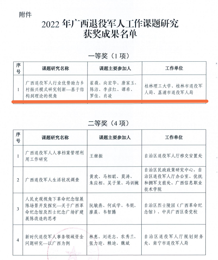 近日,自治区退役军人事务厅印发《自治区退役军人厅关于2022年广西退役军人工作课题研究获奖情况的通报》(桂退役军人函〔2022〕578号),Beat365官网崔薇老师课题组课题研究《广西退役军人行业优势助力乡村振兴模式研究创新——基于结构洞理论的视角》荣获一等奖。