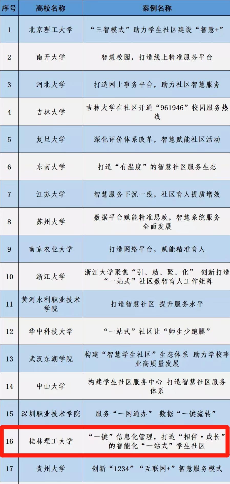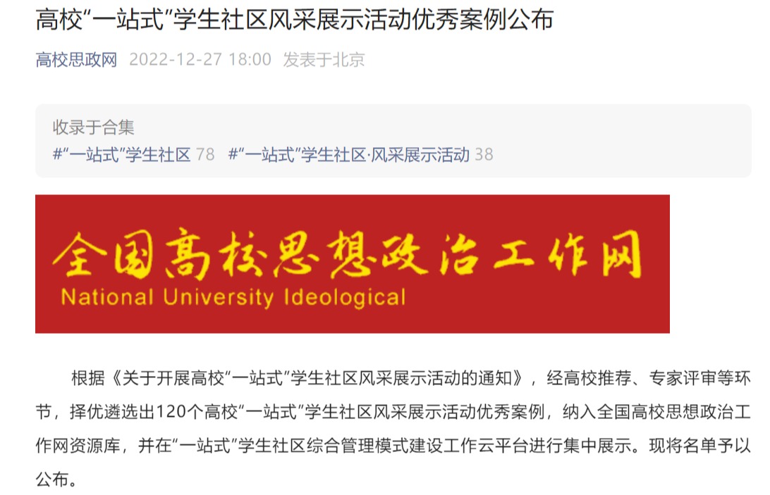 据悉,此次案例评选活动旨在丰富“一站式”学生社区综合管理模式建设内涵,充分展示高校学生社区作为学生党建前沿阵地、“三全育人”实践园地、平安校园样板高地的育人成效。活动按照“党建引领、三全育人、平安社区、智慧服务”等4个单元分类展示学生社区建设风采,共有全国120所高校(广西仅3所)“一站式”学生社区分别入选各个模块优秀案例。