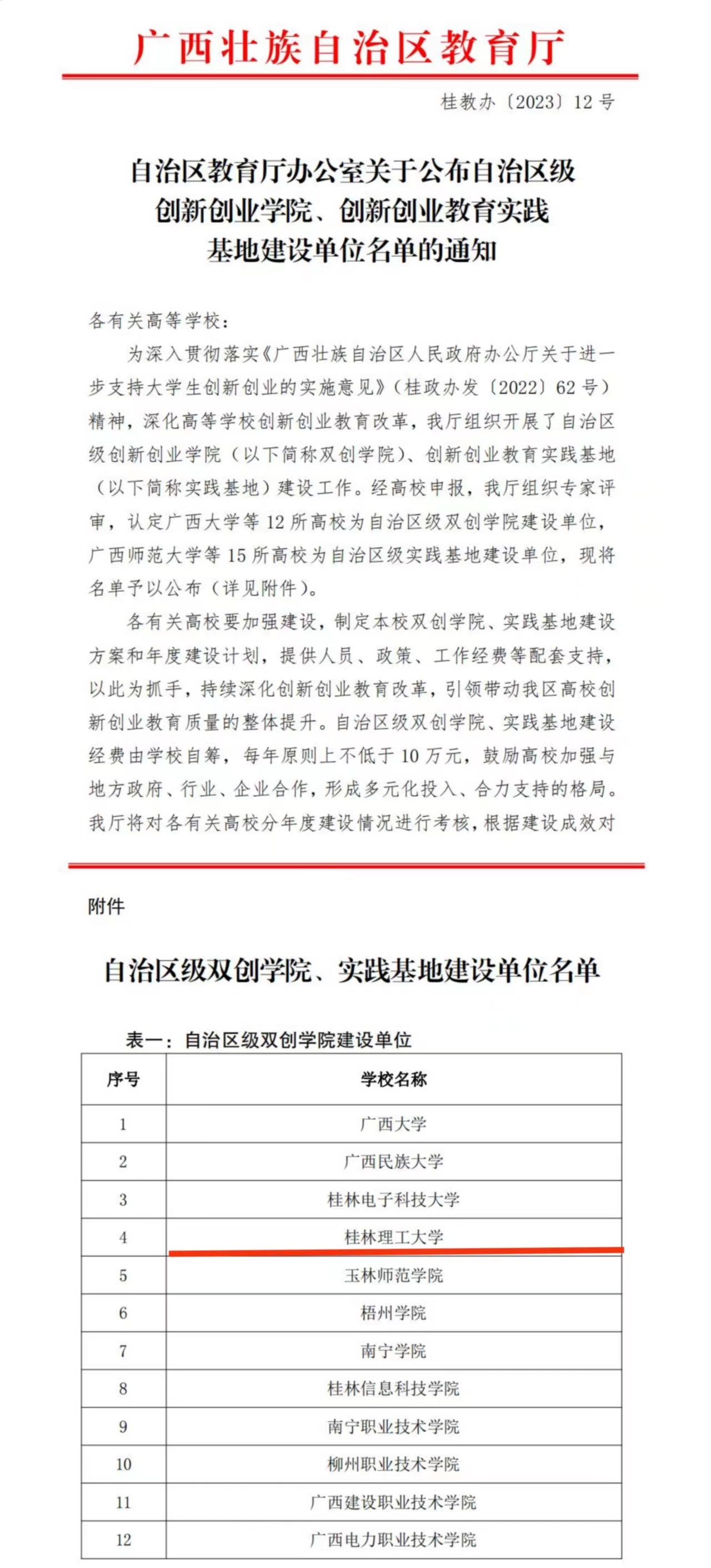 为贯彻落实《广西壮族自治区人民政府办公厅关于进一步支持大学生创新创业的实施意见》(桂政办发〔2022〕62 号)精神,深化高等学校创新创业教育改革,自治区教育厅于近日组织开展了自治区级创新创业学院、创新创业教育实践基地建设工作。经学校申报、自治区教育厅组织专家评审等环节,Beat365官网被认定为自治区级创新创业学院建设单位。