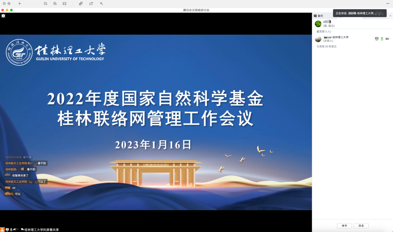 本次会议传达了2022年度国家自然科学基金管理工作会议精神,解读了2023年度科学基金项目申报注意事项及进一步深化改革的方向,总结了桂林联络网2022年度科学基金项目申报立项情况,分享了桂林联络网获评基金管理先进地区联络网的喜讯,各地区联络网各依托单位管理人员就基金申请政策变化、过程管理、资金经费等日常管理工作中疑难的问题展开了热烈讨论。