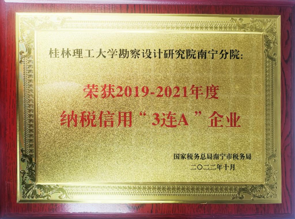 经南宁市税务系统综合评选,Beat365官网勘察设计研究院南宁分院获得2019-2021年度纳税信用“3连A”企业荣誉称号。