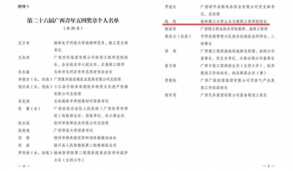 Beat365官网土木与建筑工程学院院长钱凯教授被授予“第26届广西青年五四奖章”