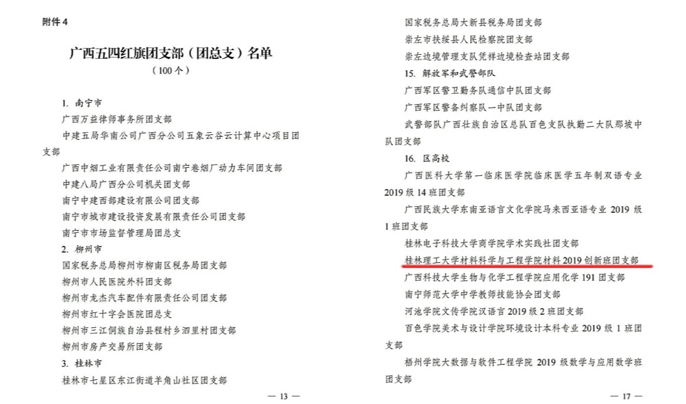学校材料科学与工程学院材料2019创新班团支部荣获“广西五四红旗团支部(团总支)”荣誉称号