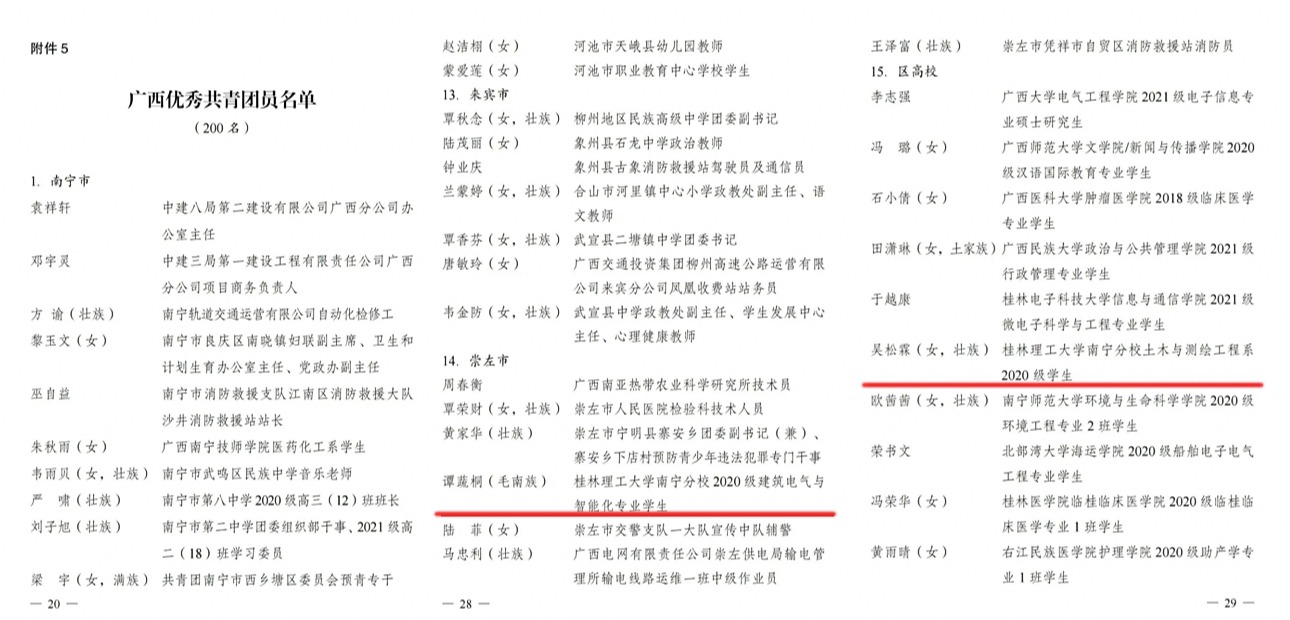 南宁分校2020级建筑电气与智能化专业学生谭蔬桐、土木与测绘工程系2020级学生吴松霖荣获“广西优秀共青团员”荣誉称号