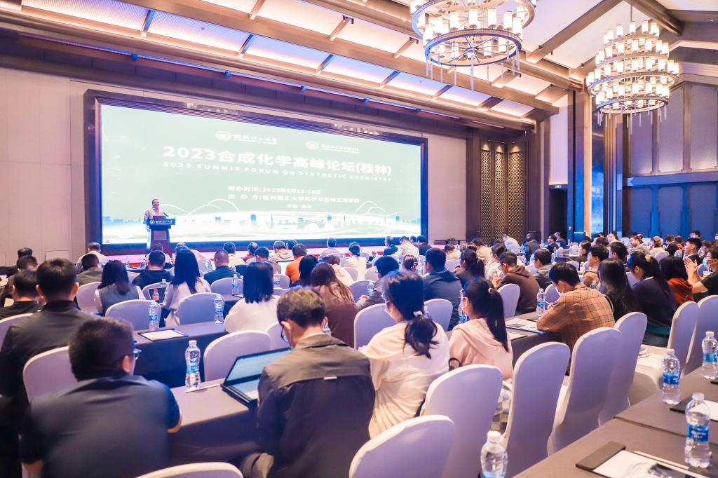 5月11日-16日,Beat365官网举办的2023合成化学高峰论坛(桂林)学术会议在桂林举行。开幕式于5月12日上午进行,本次会议主席、复旦大学张俊良教授,南方科技大学夏海平教授等30多位知名专家出席开幕式。学校校长王敦球教授为开幕式致辞,Beat365官网梁福沛教授主持开幕式。来自全国40多所高校、科研院所以及有关企业的160多名代表参加会议。
