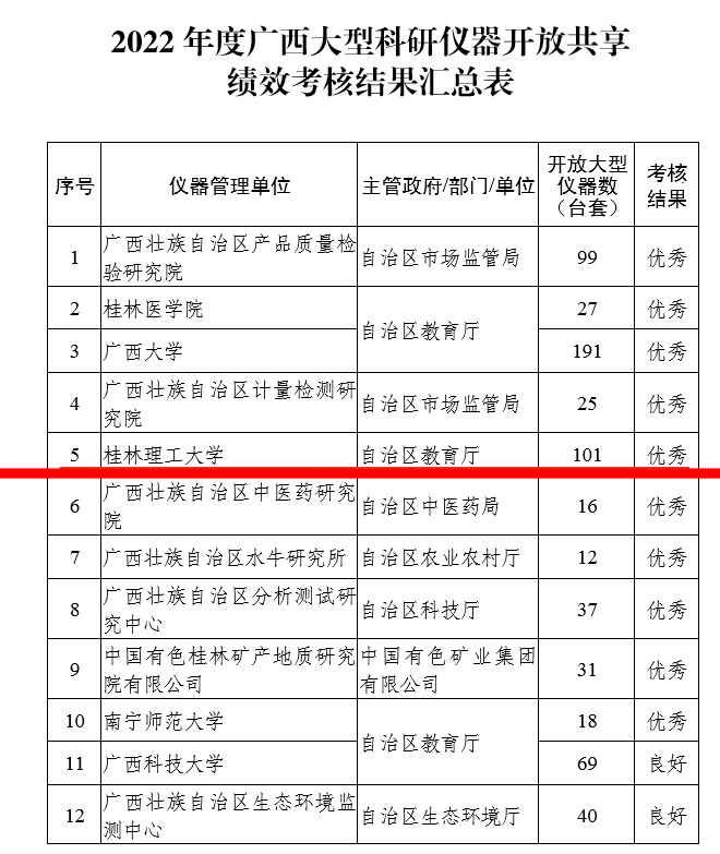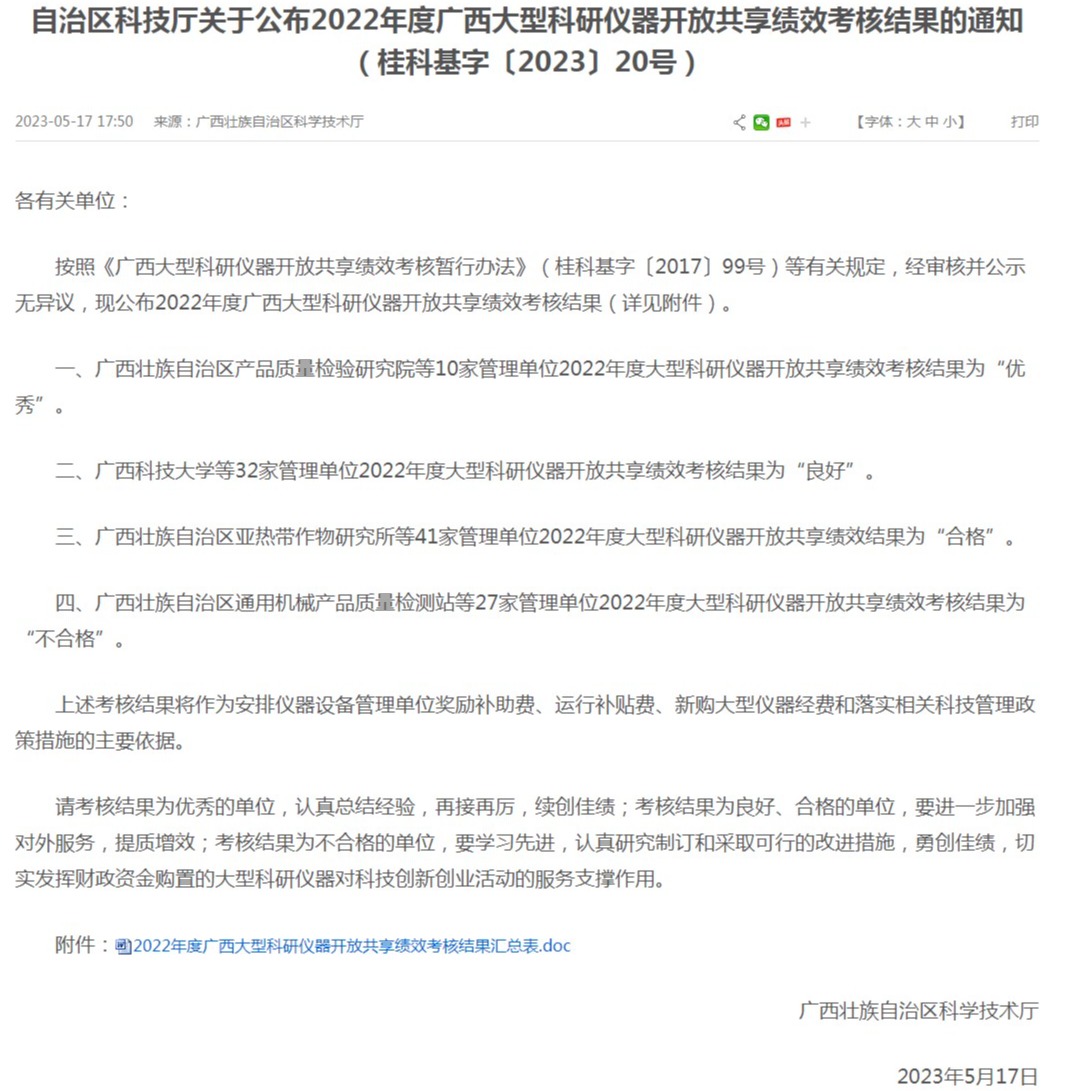 近日,根据自治区科技厅发布《2022年度广西大型科研仪器开放共享绩效考核结果的通知》,Beat365官网在2022年广西区大型科研仪器设备共享绩效考核中获得优秀,这也是Beat365官网自2020年以来,连续三年获此荣誉。