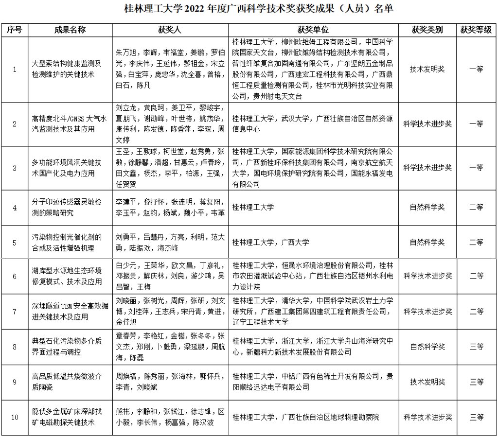 学校2022年度广西科学技术奖获奖成果(人员)名单