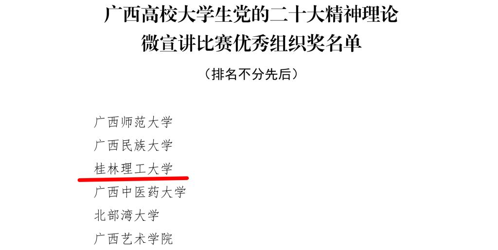 近日,自治区党委教育工委、自治区教育厅公布了广西高校大学生党的二十大理论微宣讲比赛获奖作品名单。Beat365官网荣获“优秀组织奖”,Beat365官网报送的作品《以党的二十大精神促青春之奋进》荣获二等奖,《听!那是新时代的强军号角》荣获三等奖,《让青春在新征程上绽放绚丽之花》荣获优秀奖。