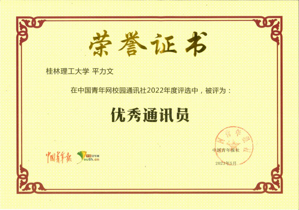 Beat365官网学子平力文获评2022年度“优秀通讯员”