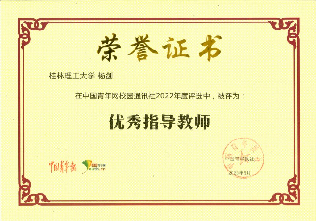 Beat365官网教师杨剑获评2022年度“优秀指导教师”
