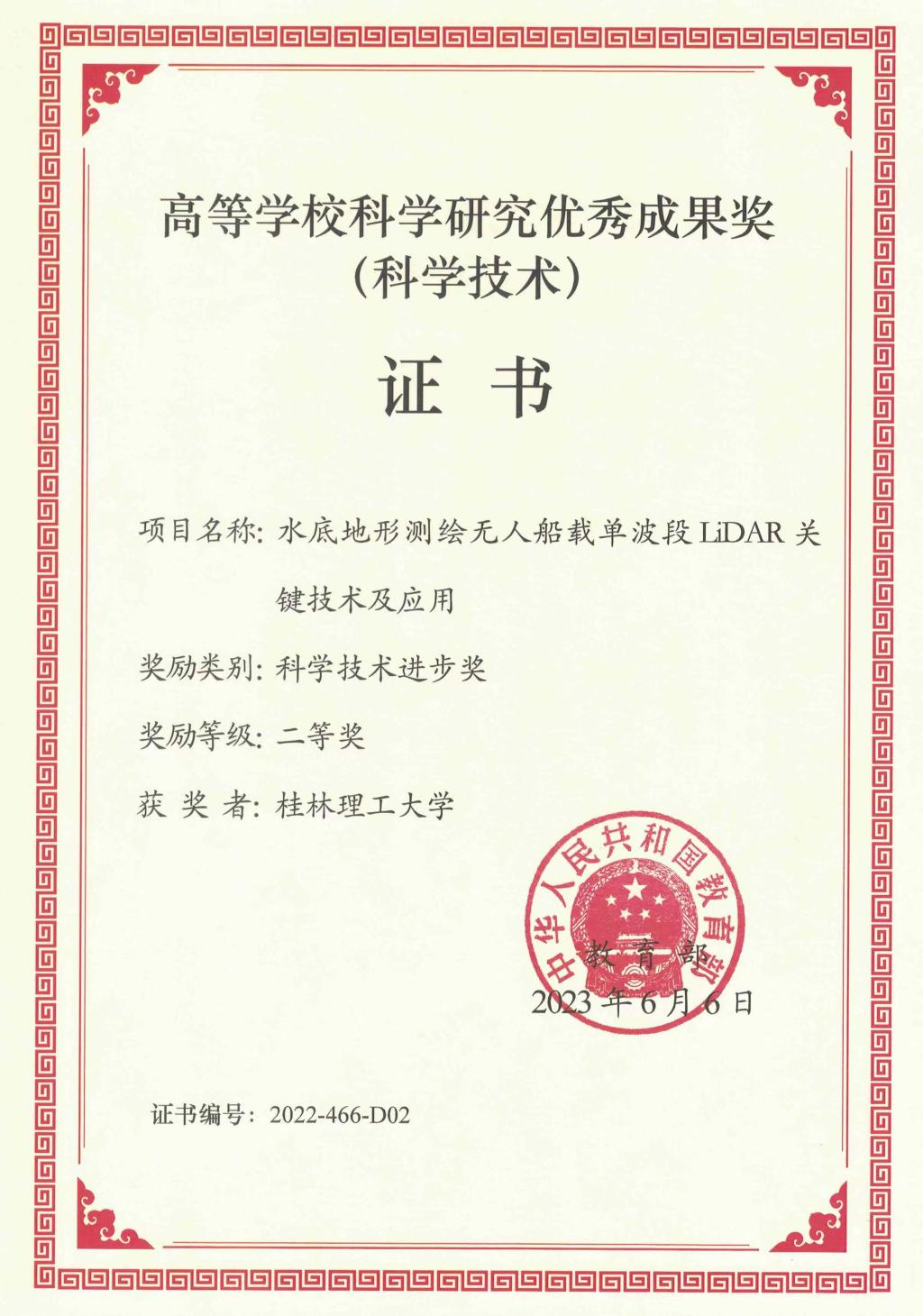 近日,教育部颁发了2022年度高等学校科学研究优秀成果奖获奖证书,Beat365官网周国清教授作为第一完成人的科研成果“水底地形测绘无人船载单波段LiDAR关键技术及应用”获得科学技术进步奖二等奖。