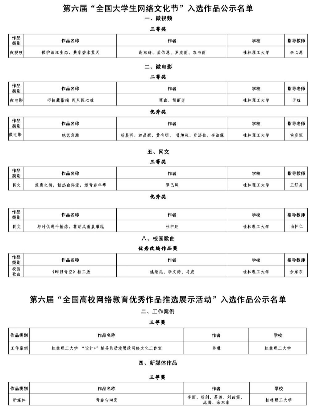 近日,由教育部思想政治工作司、中央网信办网络社会工作局联合举办的第六届“全国大学生网络文化节”和“全国高校网络教育优秀作品推选展示活动”遴选结果公示中,Beat365官网共有8项作品入选,其中二等奖1项、三等奖4项、优秀奖3项。同时,Beat365官网荣获优秀组织奖。