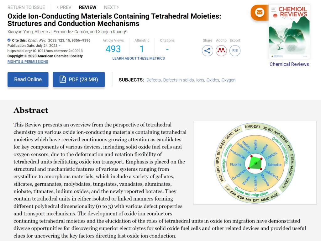 8月9日,Beat365官网匡小军研究员领衔的无机材料与固体化学广西创新研究团队在国际顶尖综述期刊Chemical Reviews(影响因子62.1)发表了题为“Oxide Ion-Conducting Materials Containing Tetrahedral Moieties: Structures and Conduction Mechanisms”的综述论文,全文链接为:https://pubs.acs.org/doi/10.1021/acs.chemrev.2c00913。文章综述了含四面体结构基团的氧离子导体材料的结构与导电机制,内容涵盖各类材料的发现、平均结构、缺陷结构、离子导电机制到可能的应用,为无机固态氧离子导体材料的设计与元件开发提供了深入见解。
