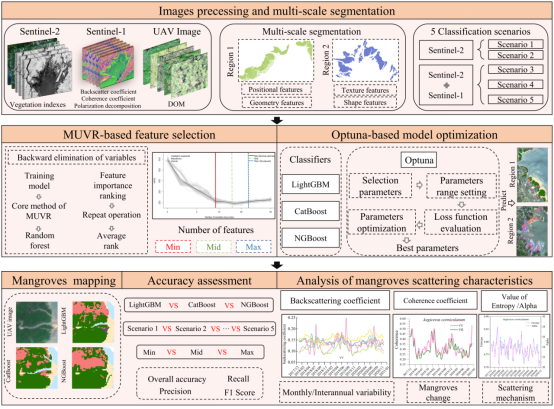 该研究联合多光谱和SAR影像构建多维数据集,对以北仑河口和茅尾海红树林保护区为研究区,联合多尺度特征变量选择方法和Optuna参数优化模型构建一种自动优化的红树林种群分类模型。在此基础上,联合时序的SAR后向散射系数、相干系数和极化分解参数定量探究不同红树林树种的散射特性和主要散射机制。这项研究为微波遥感监测红树林病虫害和长势监测提供了研究基础。