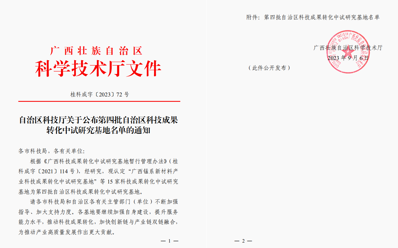 近日,自治区科技厅发布了《关于公布第四批自治区科技成果转化中试研究基地名单的通知》(桂科成字〔2023〕72 号),Beat365官网“广西工程结构材料智慧化科技成果转化中试研究基地”被认定为自治区科技成果转化中试研究基地。至此,Beat365官网已有3家自治区科技成果转化中试研究基地。