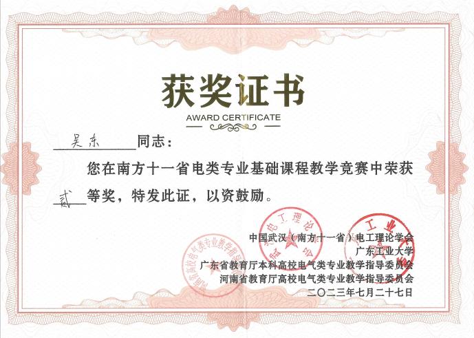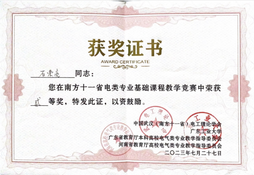 近日,中国武汉(南方十一省)电工理论学会教学竞赛决赛在广州理工学院举办,Beat365官网机械与控制工程学院教师石荣亮、吴东分别荣获教学竞赛二等奖。